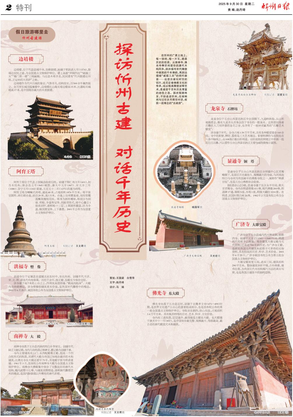 在忻州的廣袤土地上,每一塊磚、每一片瓦,都是歷史的低語。從南禪寺、佛光寺榫卯間留存的唐代木構(gòu)風(fēng)華,到洪福寺宋代雕塑中凝固的千年佛韻,再到邊靖樓“威鎮(zhèn)三關(guān)”的明代雄姿……這些古建似時(shí)空的切片,或見證著佛教文化的傳承,或以精美雕塑詮釋藝術(shù),是感受千百年歷史厚重的絕佳之選。國慶假期將至,不妨走進(jìn)忻州,在凝眸間與過往歲月隔空對(duì)話,收獲一段難忘的“古建游”。