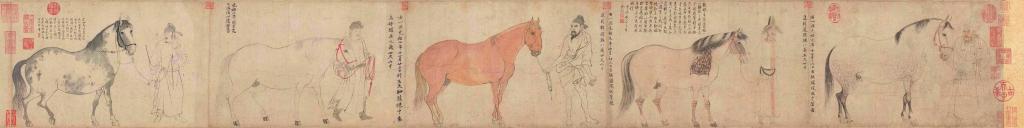 宋代每匹官馬都需造冊(cè),產(chǎn)地、身高、年齒、毛色是主要登記的信息。學(xué)者過(guò)去都認(rèn)為《五馬圖》為紀(jì)實(shí)的職貢題材繪畫(huà),不過(guò),無(wú)論是簽題還是圖像表現(xiàn),只能判斷其中兩匹馬是異族貢馬。簽題表明,這兩匹馬分別由于闐國(guó)王和青唐地區(qū)的吐蕃部落首領(lǐng)董氈進(jìn)貢,兩匹馬的牽馬人也都是異族人相貌。好頭赤題簽稱是“揀中秦馬”,“揀中”即“揀選中標(biāo)”,“揀中馬”是北宋政府對(duì)于御馬的分類之一。彼時(shí)朝廷在邊境地區(qū)集中買馬,按照買馬的區(qū)域可分為秦馬和川馬,“先是,茶馬司設(shè)買馬兩務(wù)。一在成都府,市于文、敘、黎、珍等州,號(hào)川馬。一在興元府,市于西和之宕昌寨,階之峰貼峽,號(hào)秦馬。”