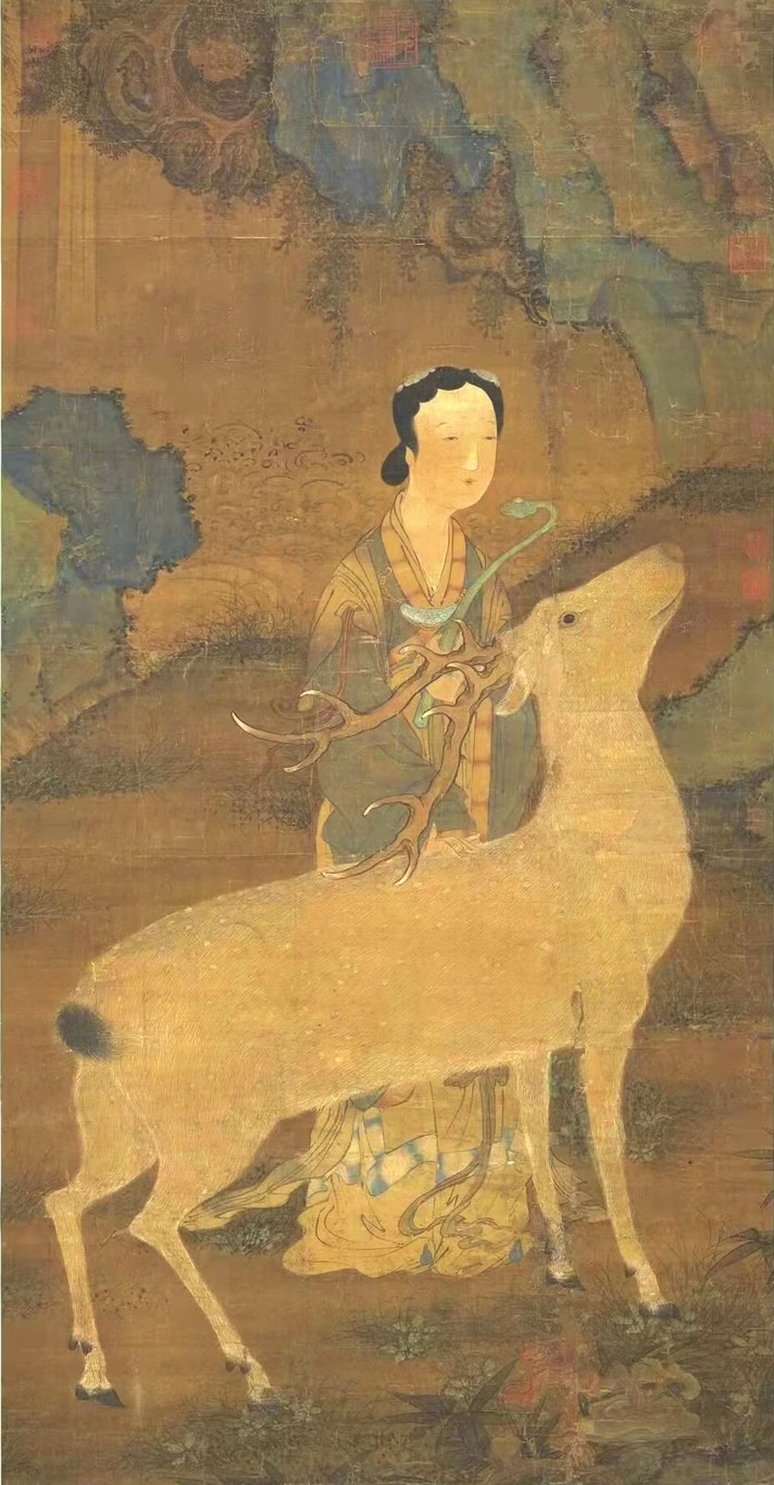 在傳統(tǒng)文化中,鹿是一種有神力的動(dòng)物,神話傳說(shuō)中鹿往往是神仙的坐騎。李白一生尋仙問(wèn)道,其《夢(mèng)游天姥吟留別》中有“且放白鹿青崖間,須行即騎訪名山”之名句。南極仙翁的白鹿,不僅被繪制在壽畫(huà)里,在文學(xué)中也大放異彩?!段饔斡洝分械陌茁咕褪菈坌悄蠘O仙翁的坐騎,偷得壽星的蟠龍拐杖后下凡為妖。在《白蛇傳》里,白娘子獨(dú)闖昆侖山,欲盜取起死回生的靈芝仙草,遭遇鶴、鹿二仙童阻攔。清代神魔小說(shuō)《女仙外史》中的鹿童化為道人,下凡后為禍人間。屢破票房紀(jì)錄的動(dòng)畫(huà)電影《哪吒2》,其中的反派之一鹿童,是無(wú)量仙翁的大弟子,擔(dān)任捕妖隊(duì)頭領(lǐng),戲份頗重。