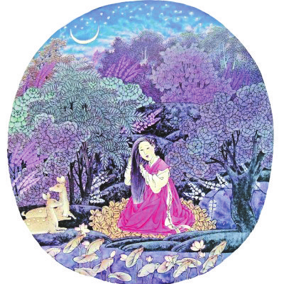夏塘風(fēng)輕花落遲(中國(guó)畫(huà))