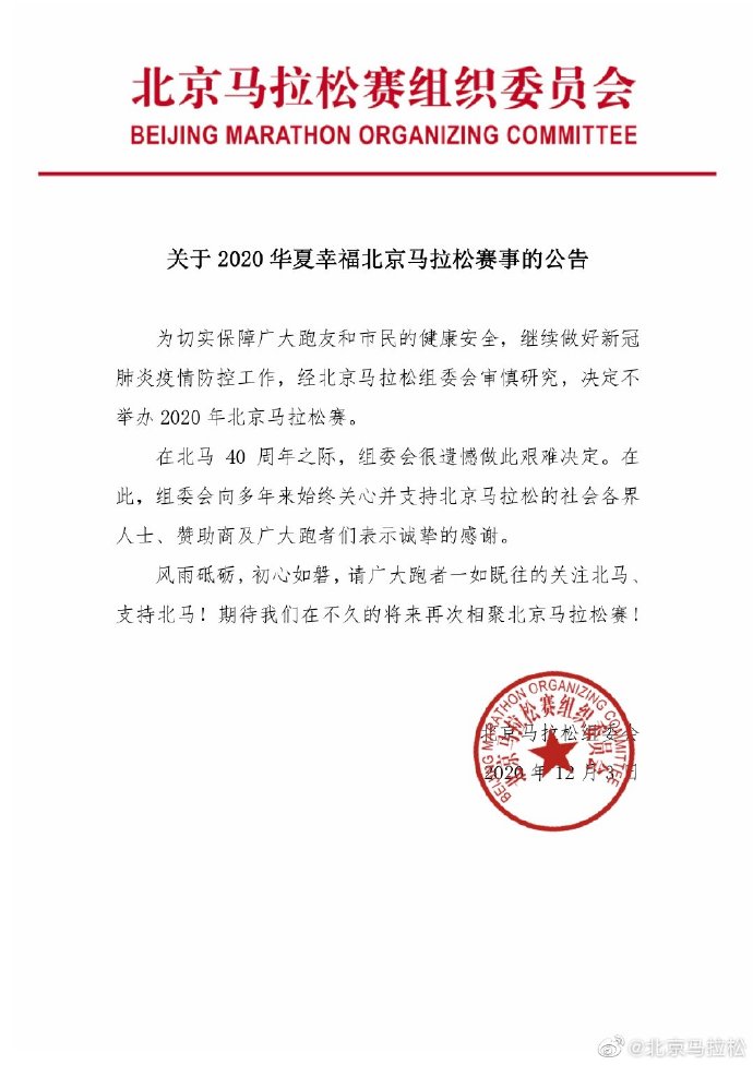 公告中表示,為切實保障廣大跑友和市民的健康安全,繼續(xù)做好新冠肺炎疫情防控工作,經(jīng)北京馬拉松組委會審慎研究,決定不舉辦2020年北京馬拉松賽。