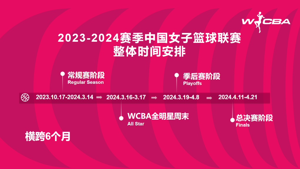 據(jù)了解,2023-2024賽季W(wǎng)CBA聯(lián)賽的整體時間跨度為6個月,考慮到新年、春節(jié),以及為國家隊備戰(zhàn)和參加巴黎奧運會資格賽留出時間,聯(lián)賽常規(guī)賽會分為兩個階段,第一階段從2023年10月17日至2024年1月1日,第二階段從2024年2月17日至3月14日。全明星周末活動將在2024年3月16至17日舉辦。季后賽和總決賽階段從3月19日至4月21日。