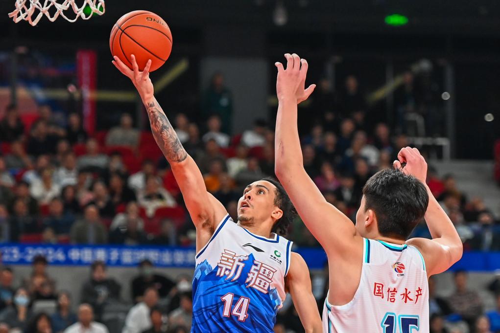 10月31日,新疆伊力特隊(duì)球員特萊斯(左)在比賽中上籃。新華社記者 丁磊 攝