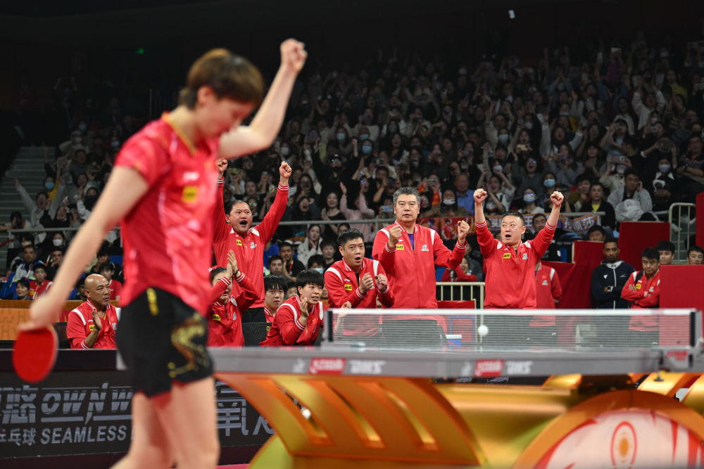 12月7日,中國(guó)隊(duì)選手王曼昱與教練員在得分后慶祝。新華社記者 胥冰潔 攝