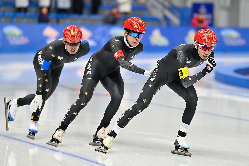 男子團(tuán)體追逐決賽是速滑青年組的最后一場(chǎng)比賽,北京隊(duì)以3分52秒69的成績(jī)摘得金牌,并打破該項(xiàng)目全國(guó)青年紀(jì)錄。