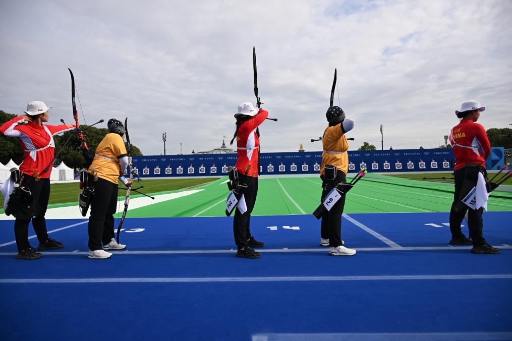 當(dāng)日上午,巴黎榮軍院上空晴空朗朗,64名女子射箭運(yùn)動(dòng)員在這處歷史建筑旁展開爭奪。中國隊(duì)派出楊曉蕾、安琦軒、李佳蔓3人出戰(zhàn)女子個(gè)人排名賽。