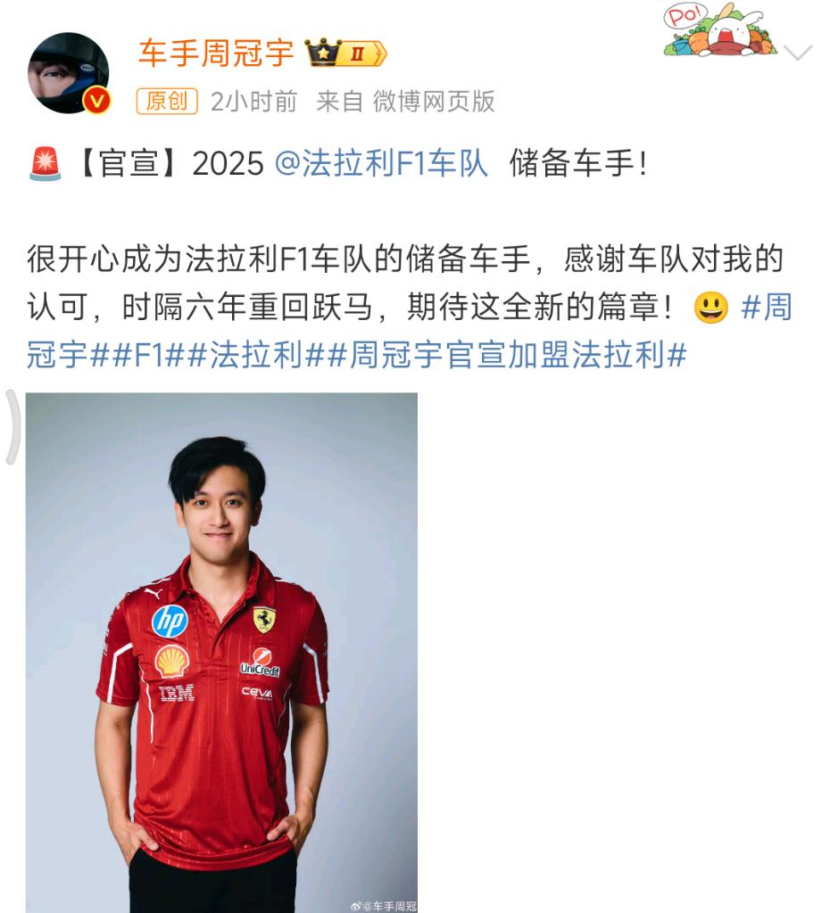 周冠宇通過個人社交平臺表示:“很開心成為法拉利F1車隊的儲備車手,感謝車隊對我的認可,時隔六年重回‘躍馬’,期待這全新的篇章!”2015年至2018年間,周冠宇曾在法拉利青訓學院度過四年時光。
