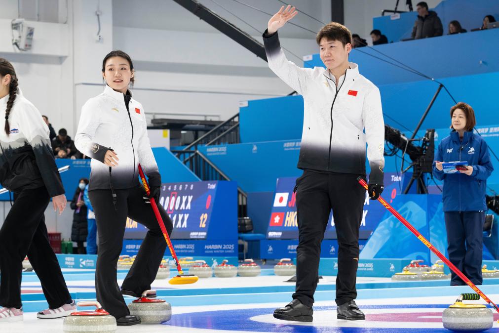 2月5日,中國隊(duì)選手王智宇(前右)/韓雨在賽后向觀眾致意。當(dāng)日,在哈爾濱舉行的2025年第九屆亞冬會(huì)冰壺混雙循環(huán)賽B組第三輪比賽中,中國隊(duì)8:3戰(zhàn)勝吉爾吉斯斯坦隊(duì)。新華社記者 謝劍飛 攝