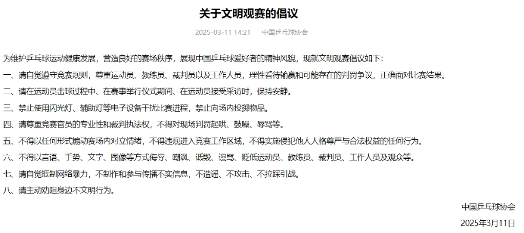 這八條倡議包括:請自覺遵守競賽規(guī)則,尊重運動員、教練員、裁判員以及工作人員,理性看待輸贏和可能存在的判罰爭議,正確面對比賽結果;請在運動員擊球過程中、在賽事舉行儀式期間、在運動員接受采訪時,保持安靜;禁止使用閃光燈、輔助燈等電子設備干擾比賽進程,禁止向場內(nèi)投擲物品;請尊重競賽官員的專業(yè)性和裁判執(zhí)法權,不得對現(xiàn)場判罰起哄、鼓噪、辱罵等;不得以任何形式煽動賽場內(nèi)對立情緒,不得違規(guī)進入競賽工作區(qū)域,不得實施侵犯他人人格尊嚴與合法權益的任何行為;不得以言語、手勢、文字、圖像等方式侮辱、嘲諷、詆毀、謾罵、貶低運動員、教練員、裁判員、工作人員及觀眾等;請自覺抵制網(wǎng)絡暴力,不制作和參與傳播不實信息,不造謠、不攻擊、不拉踩引戰(zhàn);請主動勸阻身邊不文明行為。