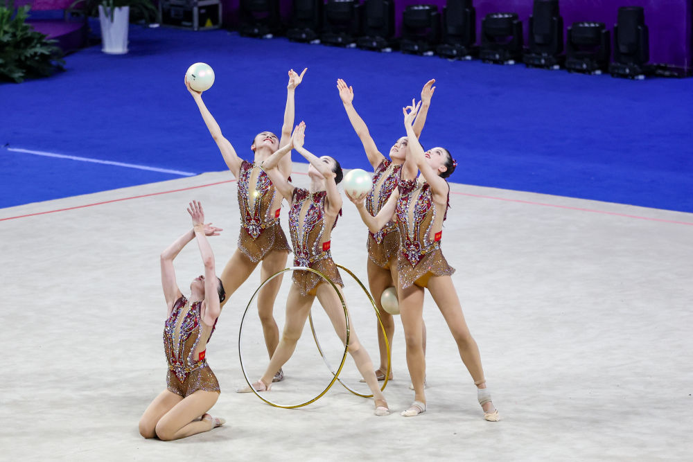 6月3日,北京體育大學(xué)隊(duì)在成年集體3球2圈資格賽中。新華社記者 黃偉 攝