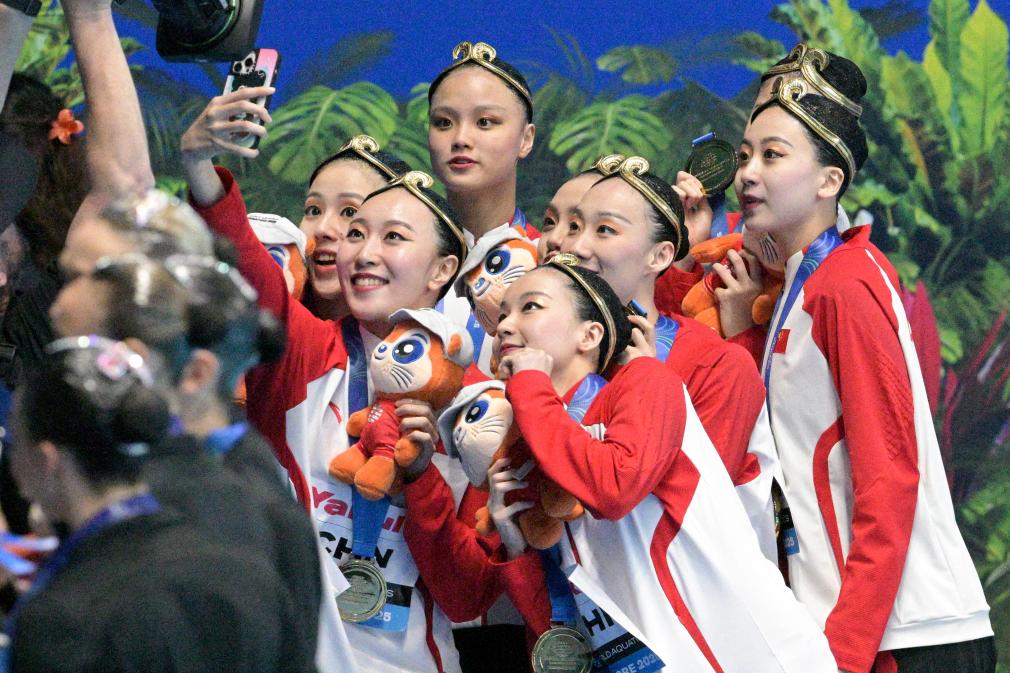 22日晚,2025年游泳世錦賽花游集體技術(shù)自選決賽,預(yù)賽排名第一的中國隊最后登場。中國隊沿用了世界杯總決賽時的“悟空”主題,比賽中姑娘們頭戴金箍,化身“天命人”,伴隨著《黑神話·悟空》的配樂,在水中翩翩起舞。