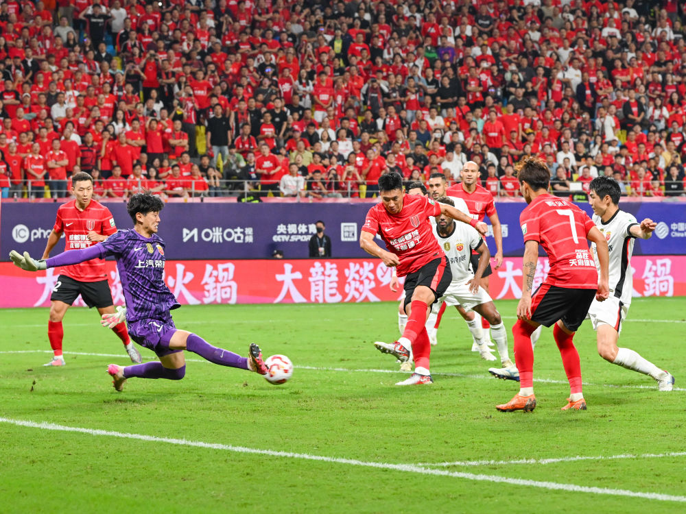8月30日,成都蓉城隊(duì)球員楊帥(左三)在比賽中射門(mén)。當(dāng)日,在四川成都進(jìn)行的中國(guó)足球超級(jí)聯(lián)賽第23輪比賽中,成都蓉城隊(duì)主場(chǎng)4:1戰(zhàn)勝上海海港隊(duì)。新華社記者 王曦 攝