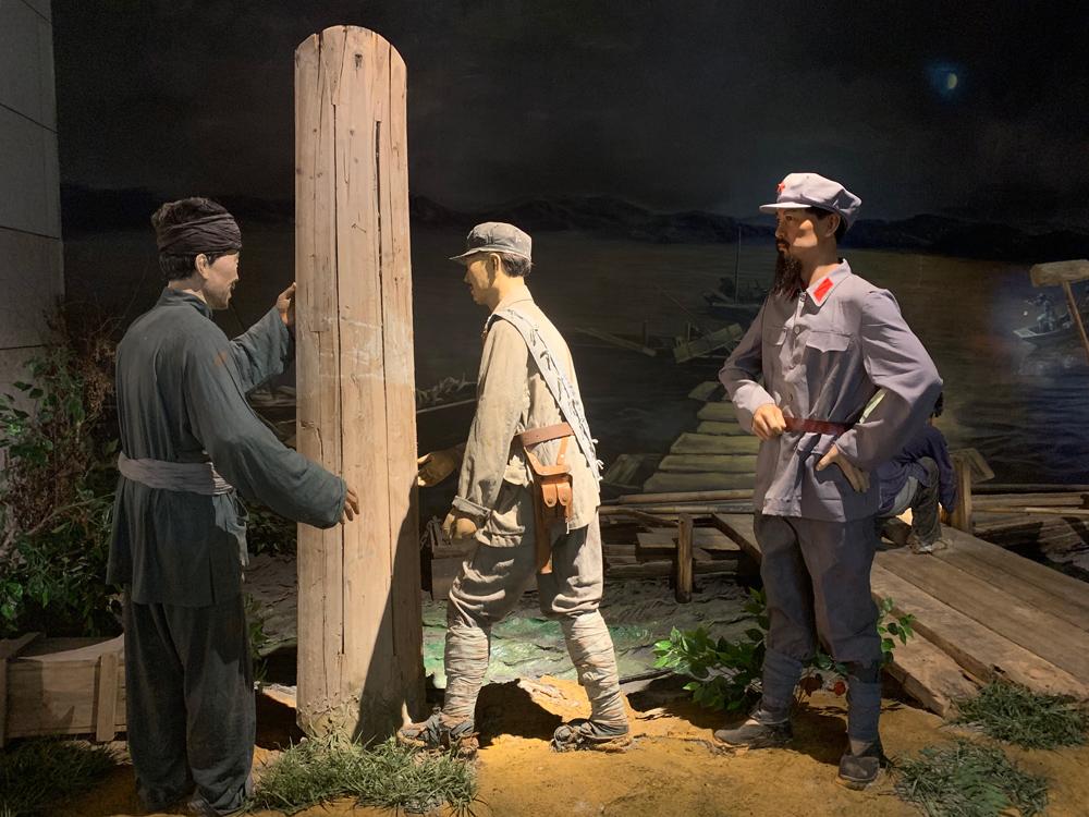 △中央紅軍出發(fā)紀(jì)念館再現(xiàn)于都老人將自己的棺木捐給紅軍搭浮橋的場(chǎng)景。(總臺(tái)央視記者郭晗光拍攝)