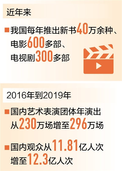 在作品質(zhì)量提升的同時,我國文化產(chǎn)品的供給能力也在持續(xù)增強。目前我國每年推出新書40萬余種、童書4萬多種、電影600多部、電視劇300多部、動漫400多部……眾多文化產(chǎn)品的生產(chǎn)規(guī)模位居世界前列。演出市場持續(xù)繁榮,2016年到2019年,國內(nèi)藝術表演團體年演出場次從230萬場增長至296萬場,國內(nèi)觀眾從11.81億人次增加至12.3億人次,其中農(nóng)村觀眾超過7億人次。