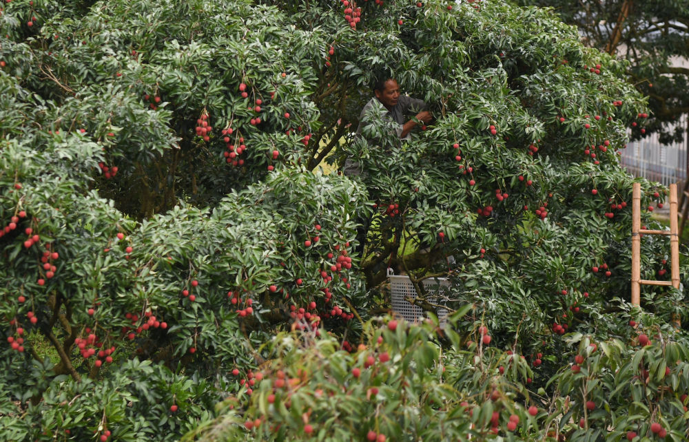 果農在廣東茂名高州名園生態(tài)園采摘荔枝(2025年6月4日攝)。新華社記者 鄧華 攝