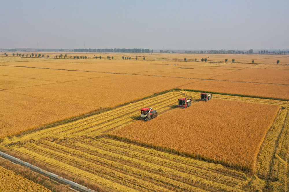 在吉林省公主嶺市,吉林省米兜種植農民專業(yè)合作社進行機械化收割水稻作業(yè)展示(2025年10月14日攝,無人機照片)。新華社記者 張楠 攝