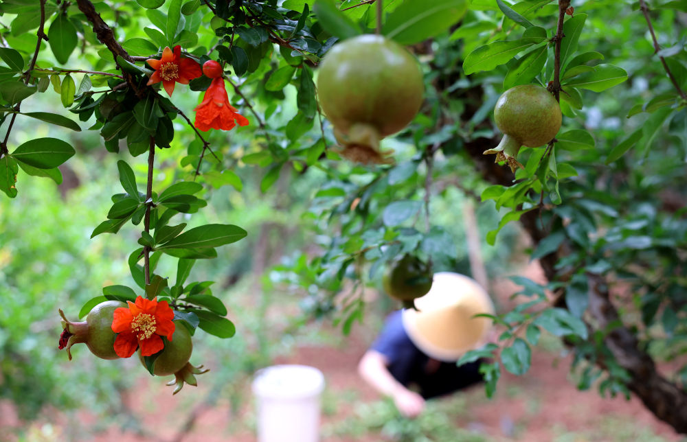 果農在山東棗莊嶧城石榴園的石榴樹下勞作(2025年6月18日攝)。新華社發(fā)(孫中喆 攝)