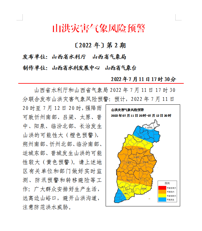山西省水利廳和山西省氣象局2022年7月11日17時30分聯(lián)合發(fā)布山洪災害氣象風險預警:預計,2022年7月11日20時至7月12日20時,強降雨可致忻州南部、呂梁、太原、晉中、陽泉、臨汾北部、長治發(fā)生山洪的可能性大(橙色預警),朔州南部、忻州北部、臨汾南部、運城東部、晉城發(fā)生山洪的可能性較大(黃色預警)。