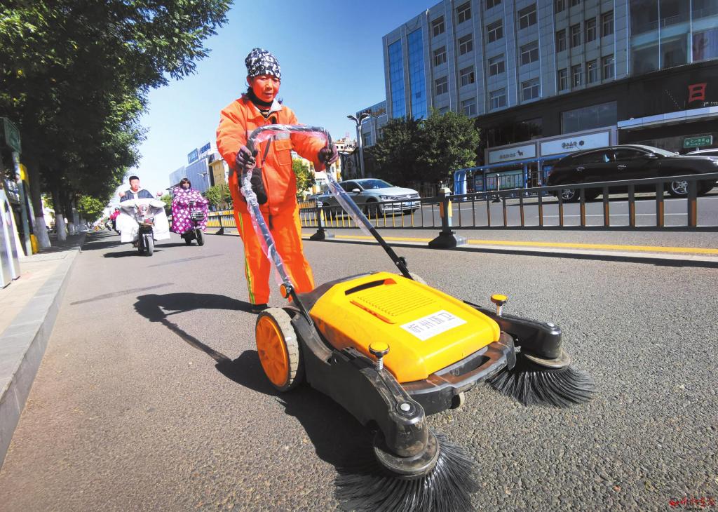 10月21日,環(huán)衛(wèi)工人在城區(qū)七一南路用新配置的無塵手推式掃地機進行清掃作業(yè)。為鞏固提升創(chuàng)文成果,市環(huán)衛(wèi)處狠抓清掃保潔、嚴控二次污染,多舉措提升衛(wèi)生質(zhì)量,確保市民有良好的工作和生活環(huán)境。 (張存良 攝)