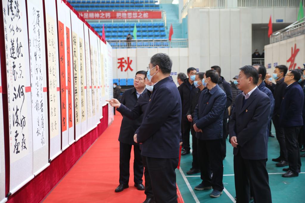 活動(dòng)現(xiàn)場(chǎng),專業(yè)人員為縣領(lǐng)導(dǎo)講解書法類參展作品的詳細(xì)內(nèi)容。