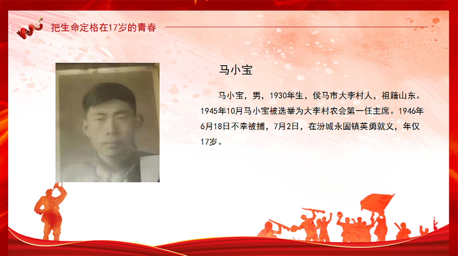 把生命定格在17歲的青春 宣講人:馬麗俊 大家好!我叫馬麗俊,今天我宣講的是侯馬市大李村馬小寶烈士的事跡。我是馬小寶烈士的侄孫女,有關(guān)大爺爺馬小寶的故事,很小的時候爺爺就經(jīng)常給我講,講大爺爺是一個什么樣的人,他是怎么犧牲的,犧牲的時候多么勇敢。每年清明節(jié)我也會跟著大人去坐落在村口大路旁的“馬小寶烈士陵園”為大爺爺上墳。那時候覺得他就是我一個沒有見過面的大爺爺,也沒有什么特別了不起的。對大爺爺進一步的了解是我上小學(xué)三年級的時候開始的,那年我9歲,成了一名光榮的少先隊員,清明節(jié)那天我和同學(xué)們打著紅領(lǐng)巾,帶著少先隊先鋒隊隊旗,唱著中國少年先鋒隊隊歌,在老師的帶領(lǐng)下來到“馬小寶烈士陵園”為大爺爺掃墓。記得,那是一個下著小雨的上午,大爺爺?shù)哪骨皵[滿了鮮花,有很多大人排著隊向大爺爺默哀致敬,其中一個中年人還向大家介紹了大爺爺?shù)氖论E。以前我不知來過大爺爺?shù)牧陥@多少次,但這一次感覺卻跟過去完全不一樣。一走進陵園的大門,看到大爺爺?shù)哪贡吹侥敲炊嗟娜藖頌樗麙吣?,我的淚水突然止不住直往下流。當(dāng)時我哭的很傷心,我好像一下子走近了原本跟我遙不可及的大爺爺,他英勇犧牲的故事,英雄偉岸的形象,堅貞不屈的精神,不就跟我們課本上的董存瑞、劉胡蘭,還有狼牙山五壯士一樣嗎!也就是從那天開始,我心里產(chǎn)生了一種非同一般的自豪感,覺得自己有這樣一位和劉胡蘭、董存瑞一樣的英雄爺爺是多么了不起呀! 然而,真正走近大爺爺、了解大爺爺,是我十七歲那年。 十七歲,是一個人的花季,是一個人最美好的年華。 我十七歲那年,離開侯馬來到省城太原成為一名農(nóng)牧專業(yè)大學(xué)生; 爸爸十七歲那年,成為侯馬南山林場的一名林業(yè)工人; 爺爺十七歲那年,光榮入伍,成為一名進駐西藏的人民解放軍戰(zhàn)士; 大爺爺十七歲那年,為了追求理想和信仰,為了黨的革命事業(yè),為了人民的解放,勇敢地獻出了自己年輕而寶貴的生命,把生命永遠定格在了十七歲的青春。 大爺爺出生于1928年,那是個風(fēng)云動蕩的年代,社會的黑暗、欺凌、霸道、不平等籠罩著古老的中華大地。就在那樣的年月,山東一對馬姓夫婦為了躲避災(zāi)荒、饑餓,讓一家人活下來,開始了漫無目的逃荒生活。兒時的馬小寶跟著父母一路乞討,所有的苦難、艱辛和不平等都深深刻在了他幼小的心里。然而當(dāng)時只有十來歲的馬小寶卻經(jīng)常毫不吝嗇地把千辛萬苦,受盡屈辱討來的殘羹剩飯再分給其他挨餓的小朋友吃,對于他這樣的舉動,即便是大人都會感到無比的驚訝。中國有句老話說,自古英雄出少年。我想我的大爺爺就是那樣的少年英雄吧。 抗日戰(zhàn)爭全面爆發(fā)的1937年,大爺爺馬小寶跟著他的父母一路乞討來到山西侯馬大李村,善良的大李村人接納了他們一家三口,讓他們臨時寄宿在幾間破窯洞里。從那時起,大爺爺一家人結(jié)束了逃荒生涯,侯馬大李村成了他們落腳扎根的地方,成了他們能夠安身立命的家鄉(xiāng)。 大爺爺天生就具備一種很強的號召力和領(lǐng)導(dǎo)力,來到大李村很短的時間,村里的小伙伴們便都聚集在了他的周圍。他用一口濃重的山東話給小伙伴們講述他在逃荒路上所看到的一切。日寇的鐵蹄如何踐踏我們的家園,殺戮我的親人,地主豪強如何為富不仁。他一講就是大半天,但他唯獨不講他受過的苦難。這也許就是大爺爺這個少年英雄特有的性格吧。 大爺爺有個姑父叫孫光烈,是我黨在侯馬的地下黨員,公開身份是一名教書先生,經(jīng)常來往于大爺爺家,他常給大爺爺講一些革命故事和道理。打土豪分田地、解放窮苦人、減租減息等等。在孫光烈的影響下,大爺爺逐漸接受了革命思想,懂得了一些共產(chǎn)主義的道理。 大概十五歲的時候,大爺爺便在大李村建立了一支由少年組成的“兒童團”,他自告奮勇成為這個“兒童團”的頭頭。那段時間他接受黨組織交給的任務(wù),宣傳黨的思想,動員群眾同惡霸地主進行斗爭。 1945年10月,在中共曲沃縣委領(lǐng)導(dǎo)下,大李村成立了農(nóng)會,年僅十七歲的馬小寶,被大家選舉為大李村第一任農(nóng)會主席。作為一名年輕的戰(zhàn)士,大爺爺十分興奮,第一次有了組織,他如同插上了飛翔的翅膀,如饑似渴地沐浴在革命的春風(fēng)里。那時的大爺爺是那樣開心。 爺爺回憶說,那個時候很少見到他,回到家里也是匆匆吃一口飯,就又出去了,感覺他很忙。大爺爺一邊自覺提高自己的思想理論水平,一邊向農(nóng)會成員講授我黨的方針政策。他一邊工作一邊堅持學(xué)習(xí)馬列主義知識。特別是一本《共產(chǎn)黨宣言》他當(dāng)成寶貝一直放在他的炕頭,直到他被俘的那一天,家里人才把那些看不懂,但知道一定是很有用的書本幫他藏了起來。村里老人回憶說,馬小寶雖然年紀不大,但是懂的很多,他個子雖然不算高大,但是骨子里韌性十足,村里人都服他,很多年輕人受到他的影響自愿加入到保村、護村的隊伍中來。 然而,就在這個時候,國民黨反動派挑起了全國內(nèi)戰(zhàn),中國共產(chǎn)黨領(lǐng)導(dǎo)解放區(qū)人民,一方面對付國民黨蔣介石的進攻,另一方面高舉和平旗幟,尋求避免內(nèi)戰(zhàn)的途徑。當(dāng)時侯馬一帶很不平靜,四周不到30里的地方,聚
