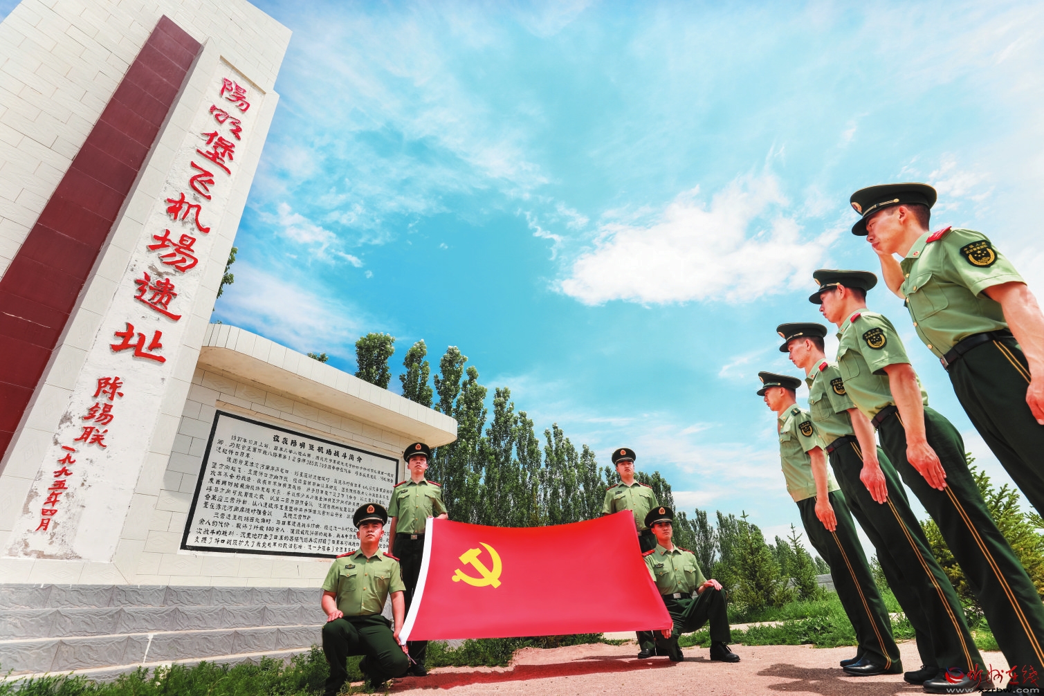 理想如磐,信念如鋼?!捌咭弧鼻跋?,武警山西總隊忻州支隊組織黨員在“陽明堡飛機場遺址”重溫入黨誓詞。 楊旭東攝