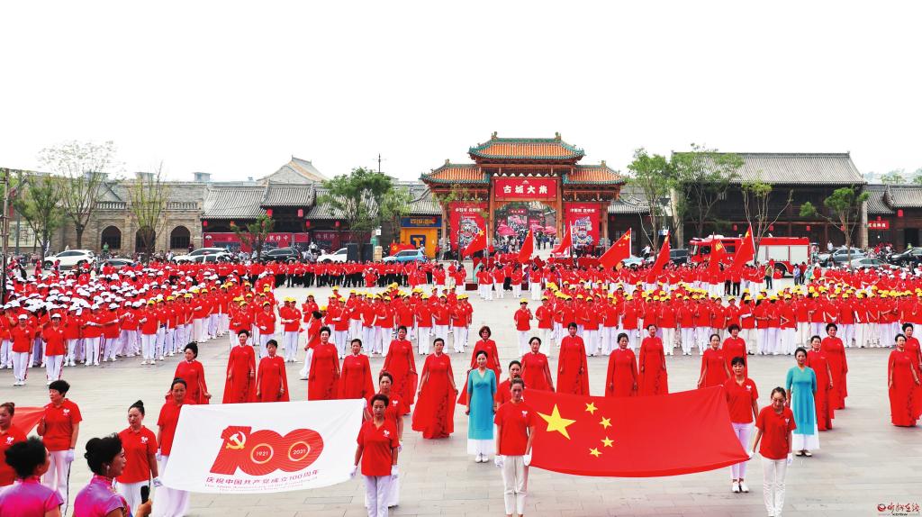 頌歌獻給黨,啟航新征程。在中國共產(chǎn)黨成立100周年之際,千余人歡聚忻州古城廣場,群情昂揚、載歌載舞喜慶黨的百年華誕。 張存良攝