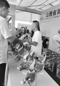 開(kāi)幕式前,提前一兩個(gè)小時(shí)安檢入場(chǎng)的觀眾,遠(yuǎn)遠(yuǎn)就看到“翔翔”的召喚,紛紛在吉祥物專營(yíng)區(qū)扎堆?!?8元一個(gè),就剩30個(gè)了。”專營(yíng)區(qū)的售賣者告訴山西晚報(bào)記者,他們也沒(méi)想到這只褐馬雞如此受歡迎,很快就要被搶沒(méi)了。大同的趙女士搶到一個(gè),她說(shuō)朋友從外地剛回來(lái)不方便出門,讓她買一個(gè)留作紀(jì)念。
