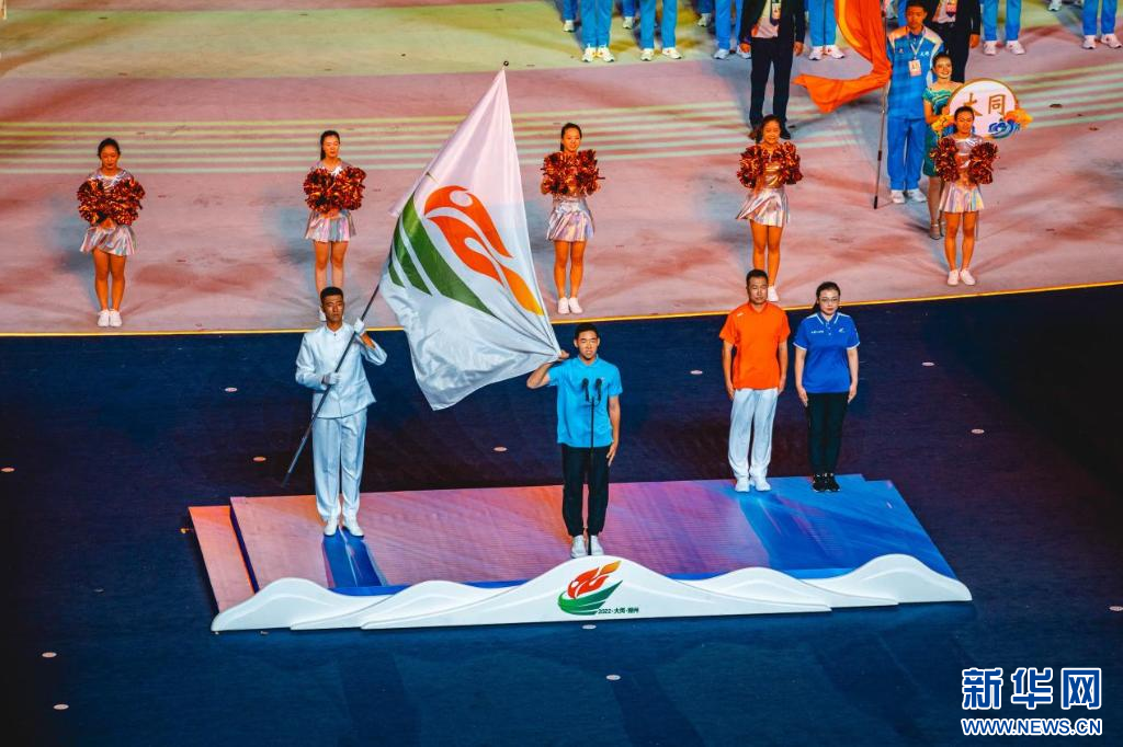 ??山西省運(yùn)動會會旗、第十六屆省運(yùn)會會旗入場。新華網(wǎng) 發(fā)(馬夢迪 攝)