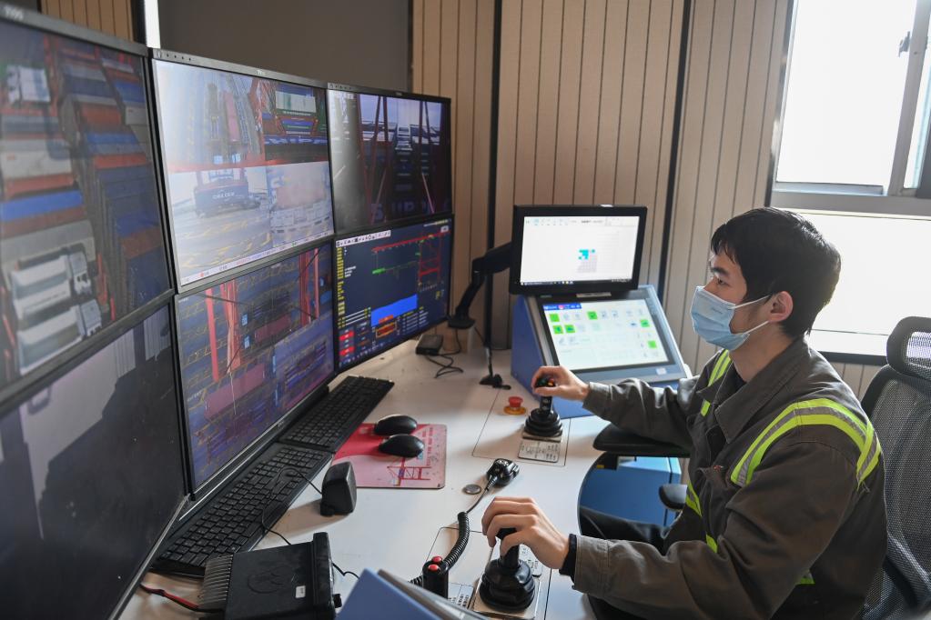 圖為寧波舟山港梅山港區(qū),橋吊司機(jī)在操作橋吊遠(yuǎn)程控制系統(tǒng)。新華社記者黃宗治 攝
