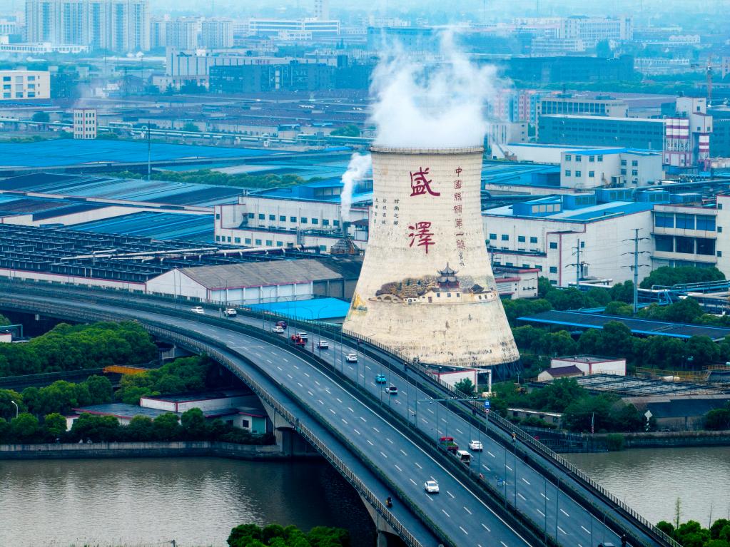 “沒想到一個小鎮(zhèn)就有‘三環(huán)’,早晚高峰還堵車。喲!這里還是‘中國絲綢第一鎮(zhèn)’?!备S記者一路調(diào)研的司機師傅說道。順著師傅的示意向窗外眺望,右前方高聳的白色冷卻塔,漸行漸近。塔上“盛澤”二字以及水鄉(xiāng)場景彩繪畫,讓這高55米、底部直徑約48米的冷卻塔,看起來像是一處“文化地標”。
