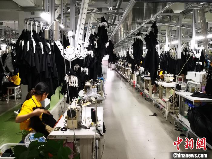 6月17日,卡賓服飾工廠內(nèi)工作人員在制作服裝。 中新社記者 劉亮 攝