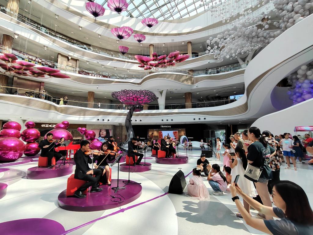 端午假期,海口國際免稅城內(nèi),伴隨著悠揚(yáng)的音樂,陽光傾瀉“天際秘林”夢幻舞臺,正在購物的游客們紛紛駐足欣賞。“一場室內(nèi)音樂會,給購物消費(fèi)增添了新意和氛圍感?!焙?谑忻耜惱俪两陉柟夂鸵魳分?。