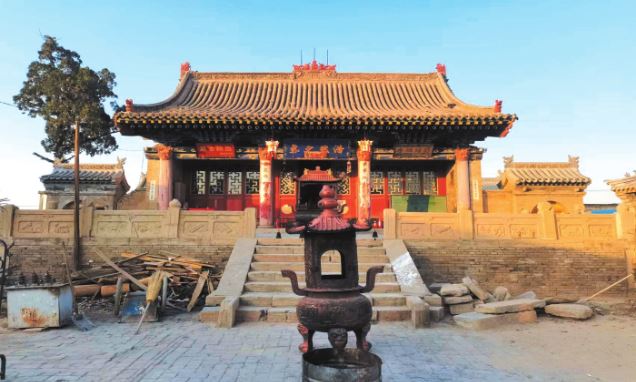 東關關帝廟位于原平市崞陽鎮(zhèn)東關村,距崞陽城東門外約100米。始建年代不詳,據(jù)正殿梁架題記載,清咸豐三年(1953)重修,現(xiàn)存建筑為清代遺構。東西長25.5米,南北寬87米,占地面積2218平方米。坐北朝南,二進院落布局,中軸線建有影壁、大門、正殿和圣母殿,兩側為東西配殿。正殿磚砌臺基,前設月臺,其上三面設勾欄、望柱,欄上雕有各種花卉、如意及禽獸。殿身面寬三間,進深六椽,單檐懸山頂。七檁前后廊式構架,斗拱五踩重翹,平身科每間一攢,出45度斜拱,前檐各間均設四扇六抹萬字紋格扇門,殿內新塑像3尊。圣母殿磚砌臺基,殿身面寬三間,進深三椽,單檐硬山頂,四檁前廊式構架。明間四扇六抹萬字紋格扇門,次間為格扇窗。殿內新塑像3尊。廟內存清代重修關帝廟碑3通,殘碑1通,石獅2對。1981年列為原平市(縣級)文物保護單位。2022年列為第三批市級文物保護單位。