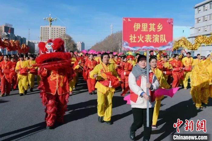 2月12日,農(nóng)歷正月初三,和田市舉行2024年“龍騰盛世·春滿萬家”社火活動,和田市伊里其鄉(xiāng)社火表演隊巡街。 張亞輝 攝