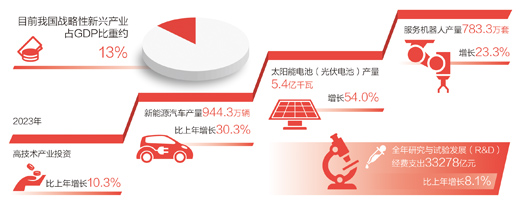 發(fā)展壯大戰(zhàn)略性新興產業(yè)。“戰(zhàn)略性新興產業(yè)具有創(chuàng)新活躍、技術密集等特點,為新質生產力發(fā)展壯大提供了巨大空間?!备呶拇碚f,近年來,我國戰(zhàn)略性新興產業(yè)蓬勃發(fā)展,目前戰(zhàn)略性新興產業(yè)占GDP比重約13%。