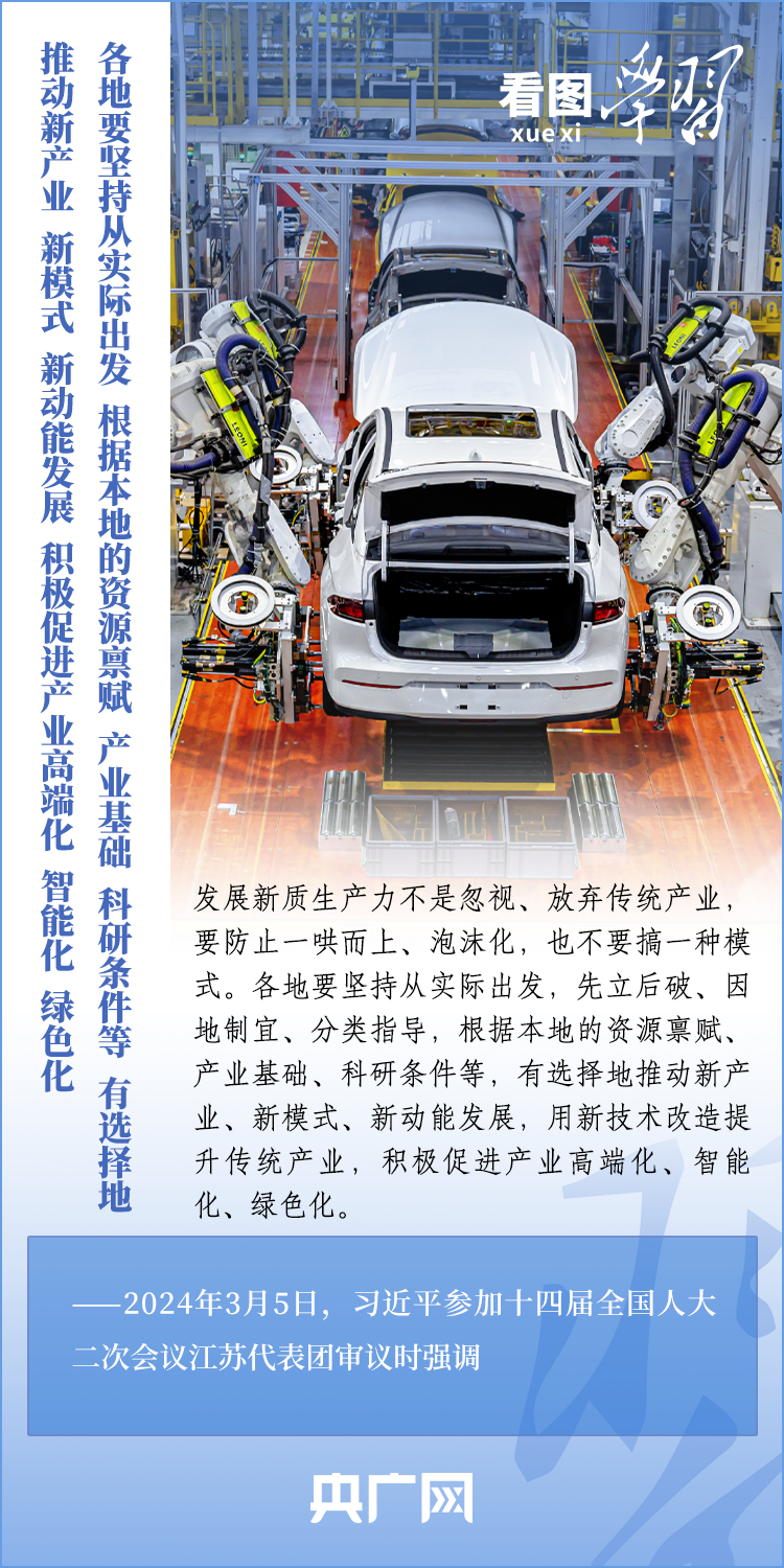3月5日,十四屆全國(guó)人大二次會(huì)議正式開(kāi)幕。5日下午,習(xí)近平總書(shū)記參加他所在的江蘇代表團(tuán)審議時(shí)強(qiáng)調(diào),要牢牢把握高質(zhì)量發(fā)展這個(gè)首要任務(wù),因地制宜發(fā)展新質(zhì)生產(chǎn)力。發(fā)展新質(zhì)生產(chǎn)力不是忽視、放棄傳統(tǒng)產(chǎn)業(yè),要防止一哄而上、泡沫化,也不要搞一種模式。一起來(lái)學(xué)習(xí)!