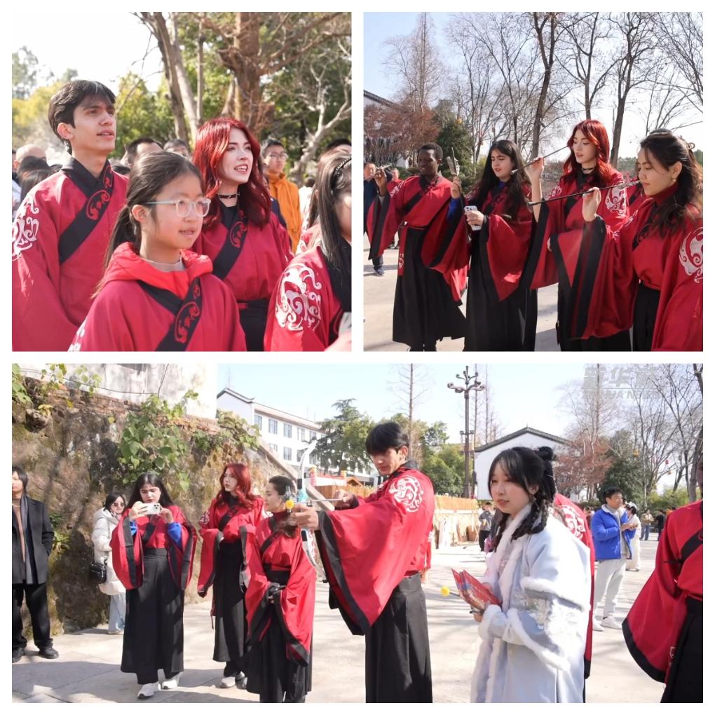 上海機場邊檢“百人外語志愿服務(wù)隊”民警正在協(xié)助外國旅客辦理入境手續(xù)。新華社記者唐斯琦 攝 上海用她獨特的城市魅力,向世界展示著一個開放、包容、充滿活力的中國形象,也讓更多的外國游客從上海出發(fā)開啟中國深度游。 ■更多體驗:外國友人沉浸式感受春節(jié)氛圍 這個春節(jié),各地都舉行了豐富多彩的新春文化活動,民俗展演、特色體驗、非遺展示……也有很多在中國學(xué)習(xí)、工作、生活的外國友人,感受到了不一樣的中國年。 春節(jié)期間,來自浙江師范大學(xué)的10多位留學(xué)生在浙江金華參加了“我在中國過春節(jié)”的體驗項目。他們身著漢服,到金華府文廟,向孔子像行拜師禮,并在新年祈福牌上書寫新年愿景。 德國企業(yè)家德克已在中國生活超過20年,因為遠(yuǎn)離家鄉(xiāng),他此前都會借助春節(jié)長假帶家人回德國探親。春節(jié)申遺成功,引起了德克的好奇。因此今年,他和家人留在中國過年。他們在江蘇金壇參加了“非遺過大年”的活動,賞非遺、寫春聯(lián)、練剪紙……沉浸式體驗春節(jié)的熱鬧氛圍。