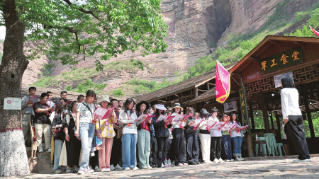 在壯麗的崖壁背景下,嘹亮的歌聲響起,《三大紀(jì)律八項(xiàng)注意》《勤儉是咱們的傳家寶》……一首首經(jīng)典旋律,將嚴(yán)明的紀(jì)律要求與樸素的廉潔觀念,通過激昂的音符直抵人心。歌聲在山谷間激蕩,廉潔的種子在集體共鳴中悄然播撒。