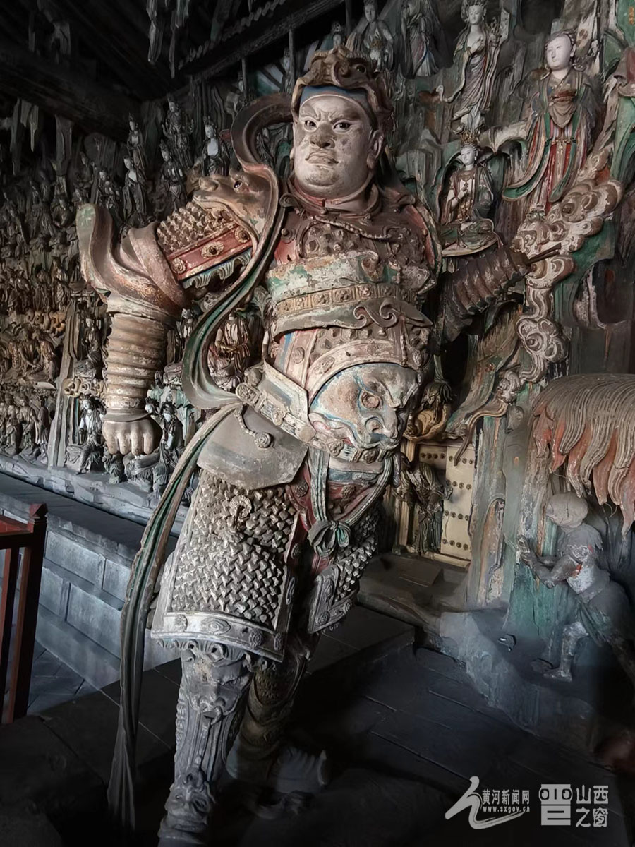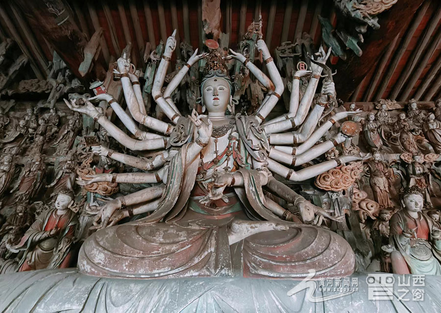 寺內(nèi)擁有總計(jì)2000多尊彩塑,大者丈余、小者尺許,每一壁龕為一獨(dú)立神話或佛教故事,人物造型生動(dòng),神態(tài)逼真,尤其以“千手觀音像”與“韋馱像”最為經(jīng)典。舞蹈《千手觀音》的靈感原型就是這尊千手觀音像。塑像高達(dá)數(shù)米,全身貼金,背后伸出上千只手臂,每只手掌上都有一只眼睛,錯(cuò)落有致,整個(gè)造像氣勢(shì)恢宏,達(dá)到雕塑藝術(shù)中和諧、完美的境界。韋馱像巍然肅立,身披甲胄,神情凝重,整個(gè)身體呈現(xiàn)出一種微妙的動(dòng)態(tài)平衡,是明代彩塑中少見的藝術(shù)杰作,被譽(yù)為“天下第一韋馱”“全國韋馱之冠”。景區(qū)講解員侯麗娟介紹:“這尊塑像的高明之處就在于匠師不落俗套,打破了一般程式的限制,賦予了韋馱一種時(shí)間的節(jié)奏性和動(dòng)作的連續(xù)性,產(chǎn)生了雕塑作品的最高境界‘不動(dòng)之動(dòng)’?!?/p>