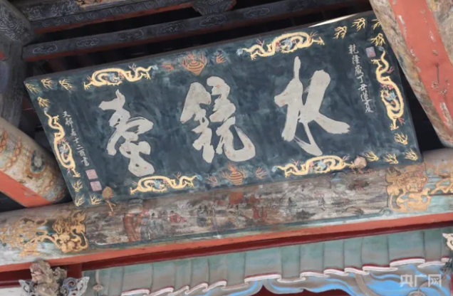 “水鏡臺(tái)”匾。水鏡臺(tái)是一座古戲臺(tái),懸掛匾額“水鏡臺(tái)”?!八R”之名取自《漢書》名句“清水明鏡不可以形逃”,寓意為人世間的善惡忠奸盡人皆知。此匾由清乾隆翰林、著名書法家楊二酉所題,書體清秀,筆力遒勁。
