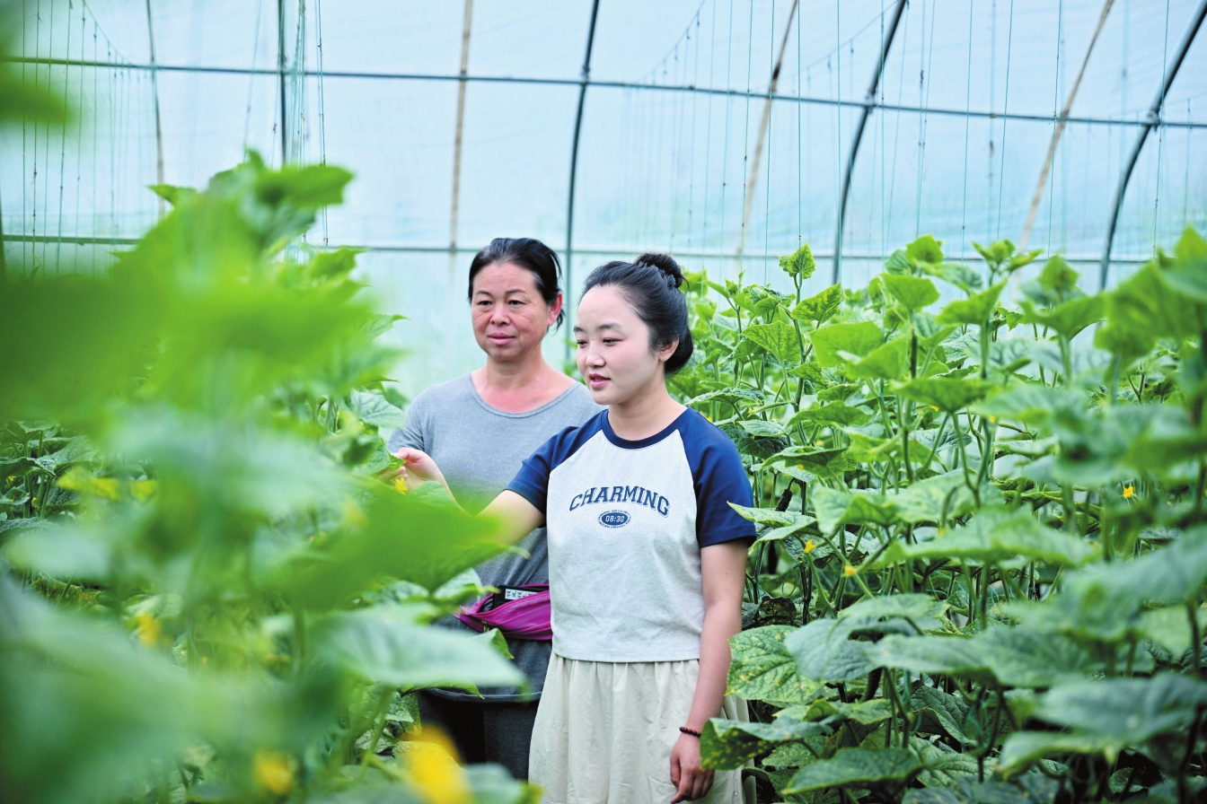 保德縣暖泉村駐村大學(xué)生正在觀察黃瓜長(zhǎng)勢(shì)。本報(bào)記者 馮曉磊攝