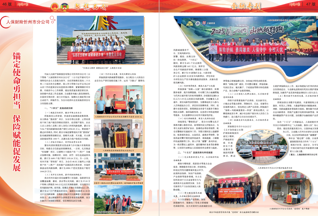 中國(guó)人民財(cái)產(chǎn)保險(xiǎn)股份有限公司忻州市分公司(以下簡(jiǎn)稱“人保財(cái)險(xiǎn)忻州市分公司”)以習(xí)近平新時(shí)代中國(guó)特色社會(huì)主義思想為指導(dǎo),全面貫徹落實(shí)黨的二十大和二十屆歷次全會(huì)精神,深入學(xué)習(xí)貫徹習(xí)近平總書(shū)記對(duì)山西工作的重要講話及重要指示精神,緊緊圍繞忻州市委、市政府中心工作部署,錨定高質(zhì)量發(fā)展首要任務(wù),堅(jiān)持穩(wěn)中求進(jìn)工作總基調(diào),主動(dòng)服務(wù)和融入新發(fā)展格局,在服務(wù)實(shí)體經(jīng)濟(jì)、助力鄉(xiāng)村振興、保障民生福祉等方面主動(dòng)擔(dān)當(dāng)、積極作為,為全市經(jīng)濟(jì)社會(huì)發(fā)展提供堅(jiān)實(shí)有力的保險(xiǎn)支撐。